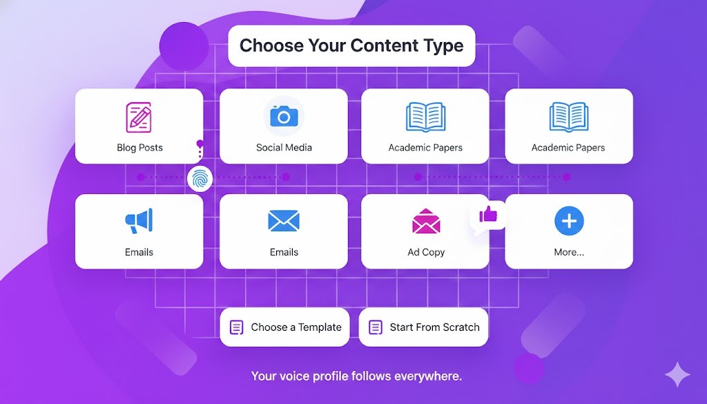 Select from blog posts, social media, academic papers, emails, ad copy, and more. Choose a template or start from scratch—your voice profile follows everywhere.