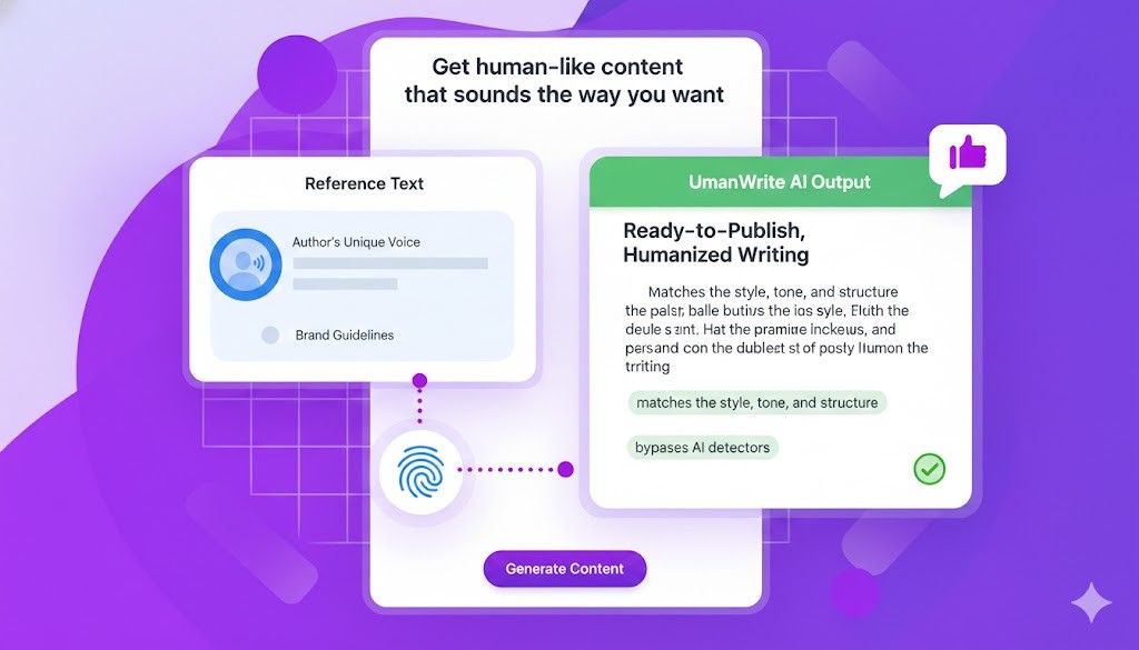 UmanWrite generates ready-to-publish, humanized writing that matches the style, tone, and structure of your reference text—whether it’s a unique author’s voice, a specific genre, or a brand voice that bypasses AI detectors.