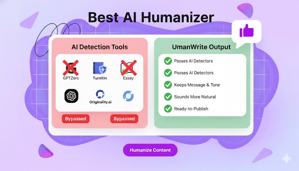 Whether it’s for school, publishing, or SEO, UmanWrite helps your content pass tools like GPTZero, Turnitin, and Originality.ai, while keeping your message and tone and making it sound more natural. It’s built for high-stakes writing where detection matters.
