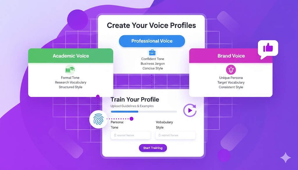 Create voice profiles for your academic, professional, or brand voice. Train each profile with clear persona, tone, vocabulary, and style guidelines.